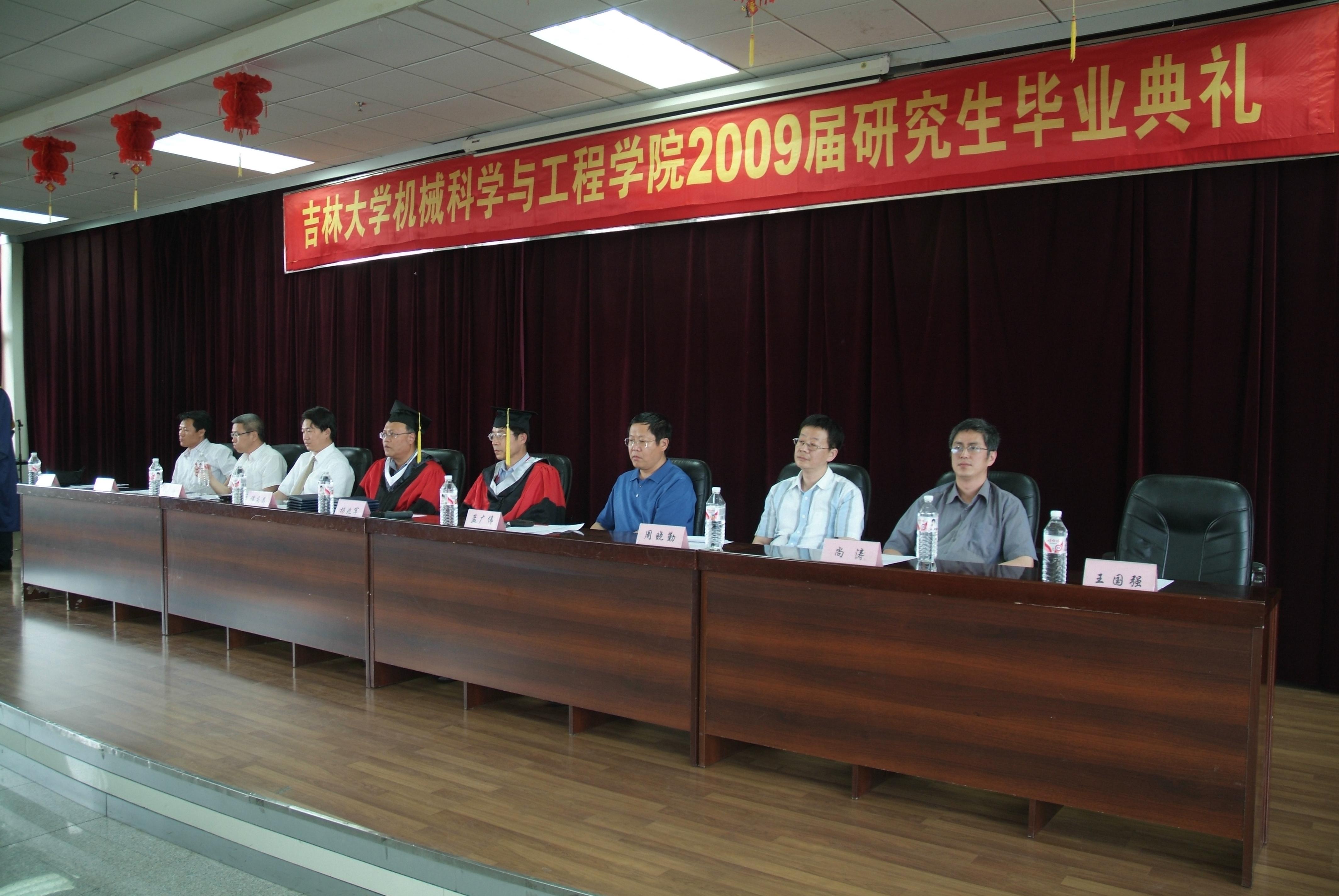 2009年6月22日下午,机械学院2009届研究生毕业典礼在机械材料馆八楼报告厅隆重召开,机械学院院长、博士生导师杨兆军教授,院党委书记、博士生导师王国强教授,械工程与力学学科学位评定分委员会主席、博士生导师谭庆昌教授,副院长、博士生导师孟广伟教授,副院长、博士生导师张雷教授,机械制造系主任、博士生导师周晓勤教授,机械电子工程系系主任、尚涛副教授,工业工程系系主任、博士生导师孔繁森教授等参加了本次毕业典礼。