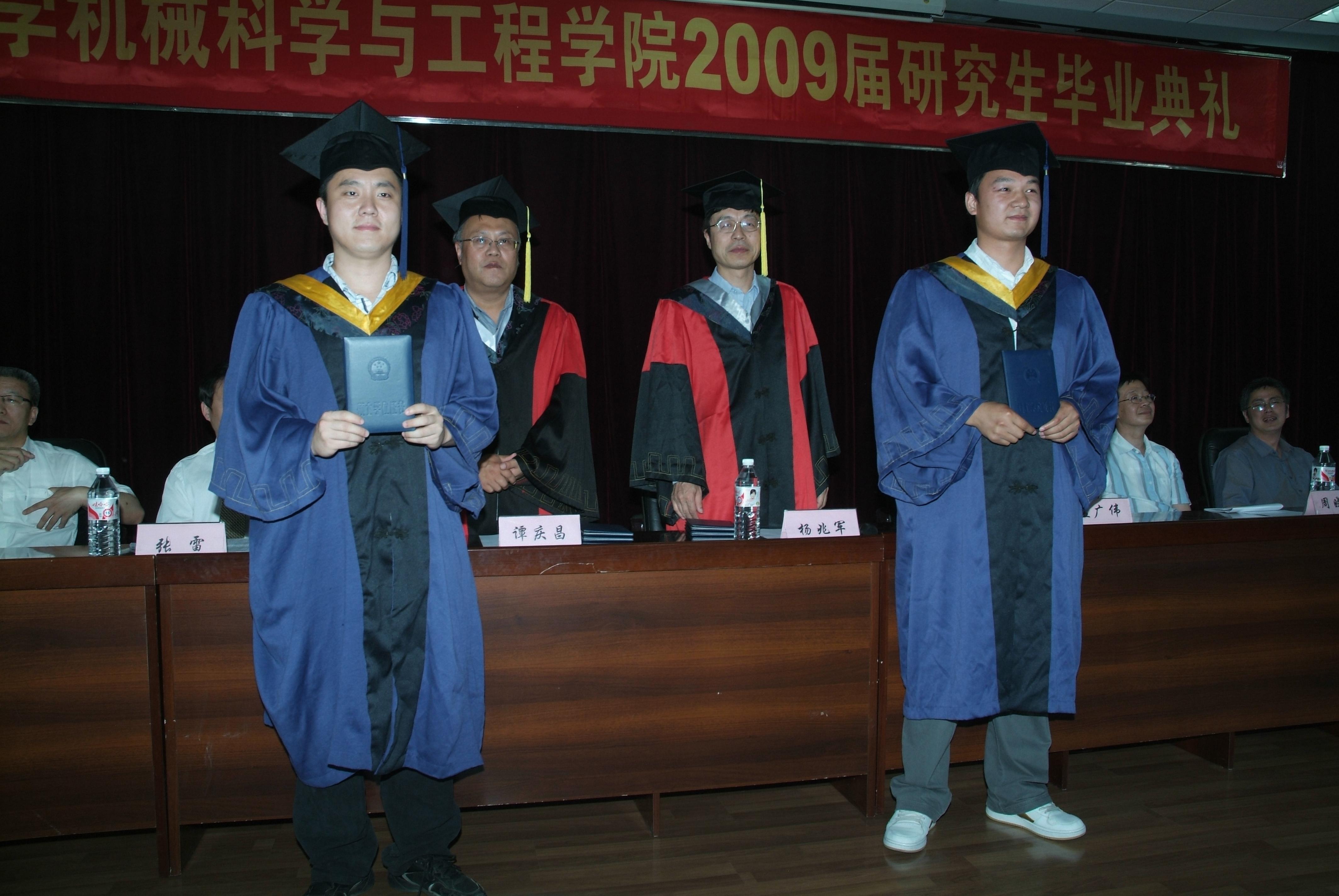典礼在庄重的国歌声中开始。副院长张雷教授宣读毕业研究生名单、获博士学位、硕士学位学生名单。副院长孟广伟教授宣读《关于表彰吉林大学2009届优秀毕业研究生的决定》,伴随着欢快的典礼进行曲,杨兆军教授、谭庆昌教授为毕业研究生代表授予学位并合影留念。蔺超代表全体毕业研究生发言,向辛勤培育他们的母校,向机械学院,向一直关心、爱护研究生同学们的领导和老师们表示衷心的感谢。周晓勤教授代表全体教师祝福每一位毕业生在未来的岁月里取得更加辉煌的成绩。