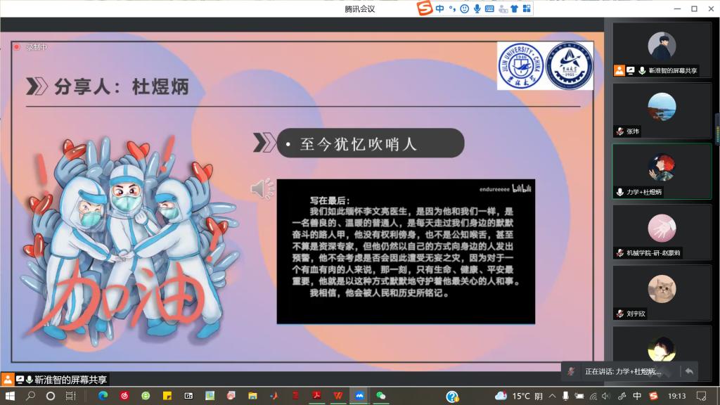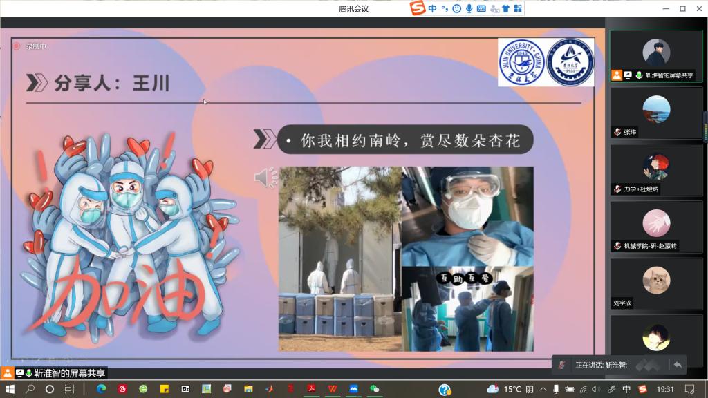 举办了“吉疫同行”抗疫故事分享会。分享会通过线上形式举办,由研究生靳淮智主持,研究生辅导员曲艺及我院部分研究生参加了本次分享会。
