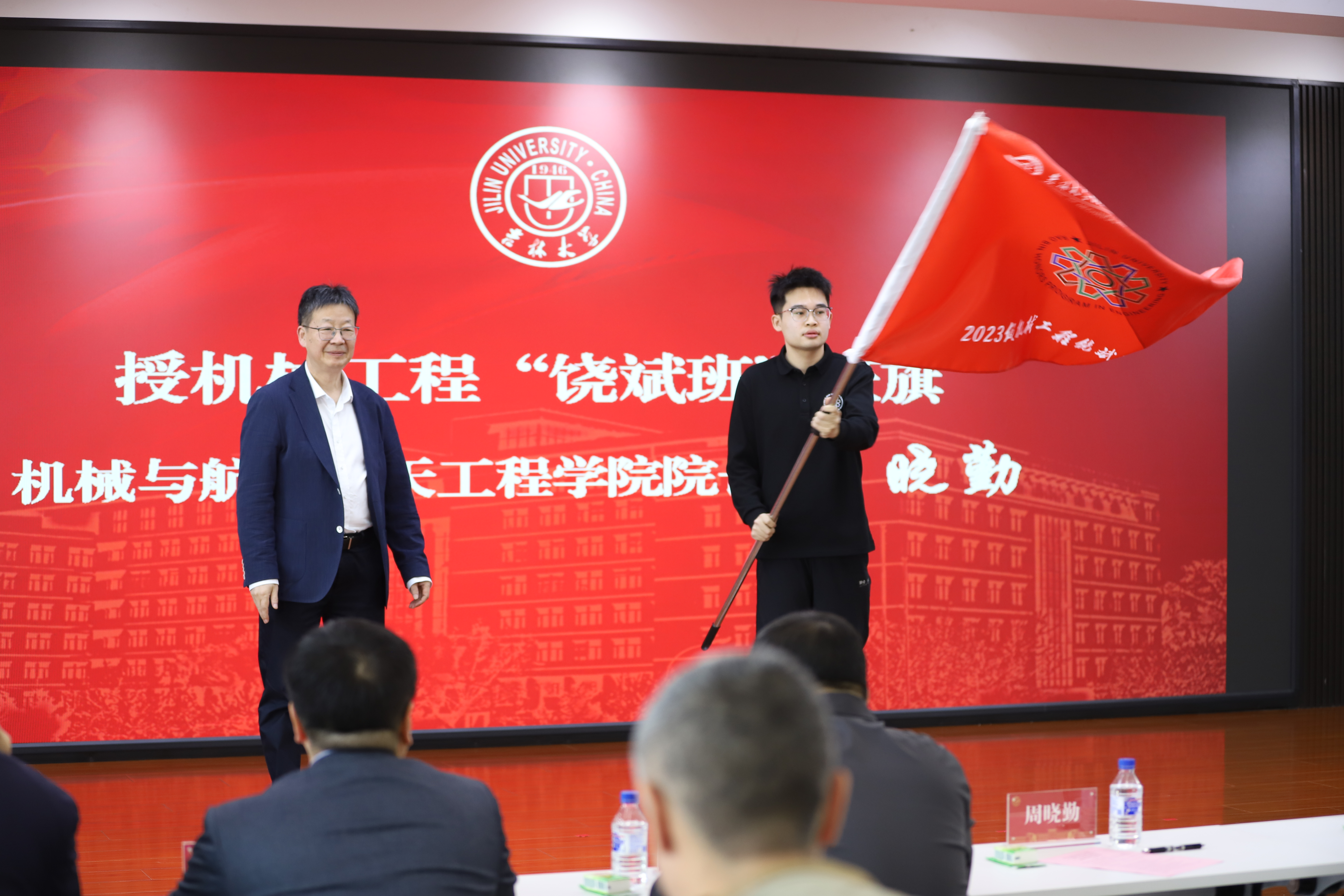 仪式伊始,郑福胜书记宣读了吉林大学党委常委、副校长、“饶斌班”首席科学家赵宏伟教授对学生们的寄语,表达了对同学们的关心、鼓励和期望。接着,周晓勤院长为机械工程“饶斌班”授班旗,象征着班级荣誉与责任的传承。随后,王医术主任为机械工程“饶斌班”学生颁发学员纪念章。这简短而庄重的环节不仅彰显了学校、学院各级领导老师对机械工程“饶斌班”发展的高度重视,也饱含了对学生们的殷切期盼。