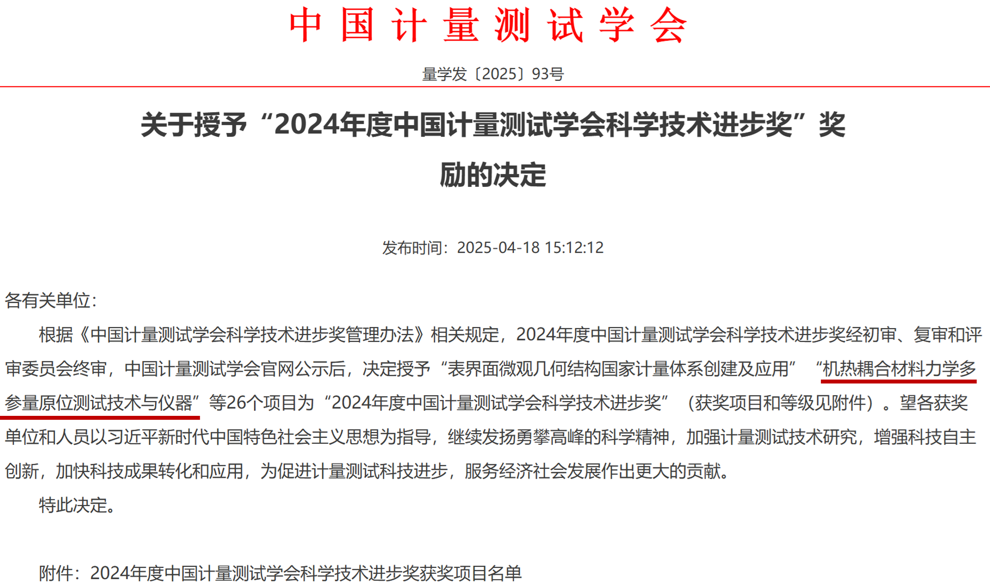 近日,中国计量测试学会公布2024年度中国计量测试学会科学技术进步奖授奖名单,我院马志超教授牵头完成的“机热耦合材料力学多参量原位测试技术与仪器”项目获一等奖。
