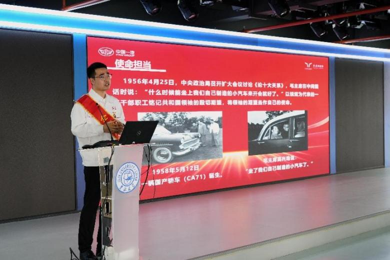 随后,赵达老师向我们详细介绍了一汽的历史和发展变迁,如今的一汽拥有十大创新和十大智能技术。在谈及自己的职责,赵达老师比喻自己如同医生,时刻保障设备的平稳运行,一旦出现故障,便迅速排查问题,确保“药到病除”。面对困难,他总是主动承担,迎难而上,从生活中汲取灵感,并将其应用于实际工作中。参加工作后,赵达老师还参加了全国机器人技能大赛,在比赛中顶住压力,灵活转换思路,最终斩获第一名,荣获“全国技术能手”称号。