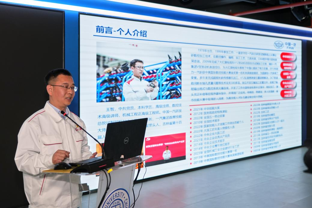 会上,王智老师深情回顾了自己的成长历程。从技校毕业后进入中国一汽研发总院工作,凭借对数控加工技术的热爱与执着,他从一名普通技工逐步成长为高级技师、正高级工程师。“技术没有捷径,唯有脚踏实地。”王智在报告中分享了自己如何通过不断学习和实践,攻克技术难关的亲身经历。他提到,在完成国内首款V型12缸发动机加工任务时,团队面临前所未有的挑战。通过反复试验和创新工艺,最终成功为红旗车装上了中国“心”。
