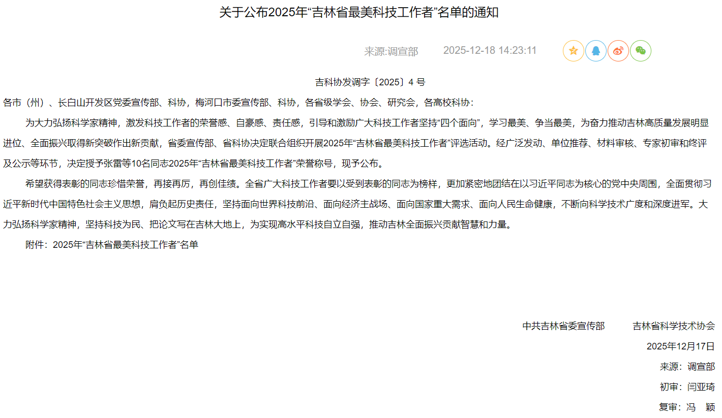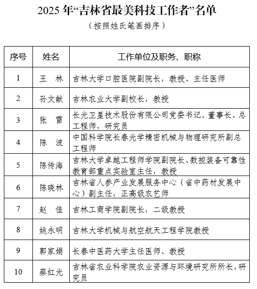 为大力弘扬科学家精神,激发科技工作者的荣誉感、自豪感、责任感,引导和激励广大科技工作者坚持“四个面向”,学习最美、争当最美,为奋力推动吉林高质量发展明显进位、全面振兴取得新突破作出新贡献,中共吉林省委宣传部、省科协联合评选出10名2025年“吉林省最美科技工作者”,我院陈传海教授、姚永明教授获此殊荣。