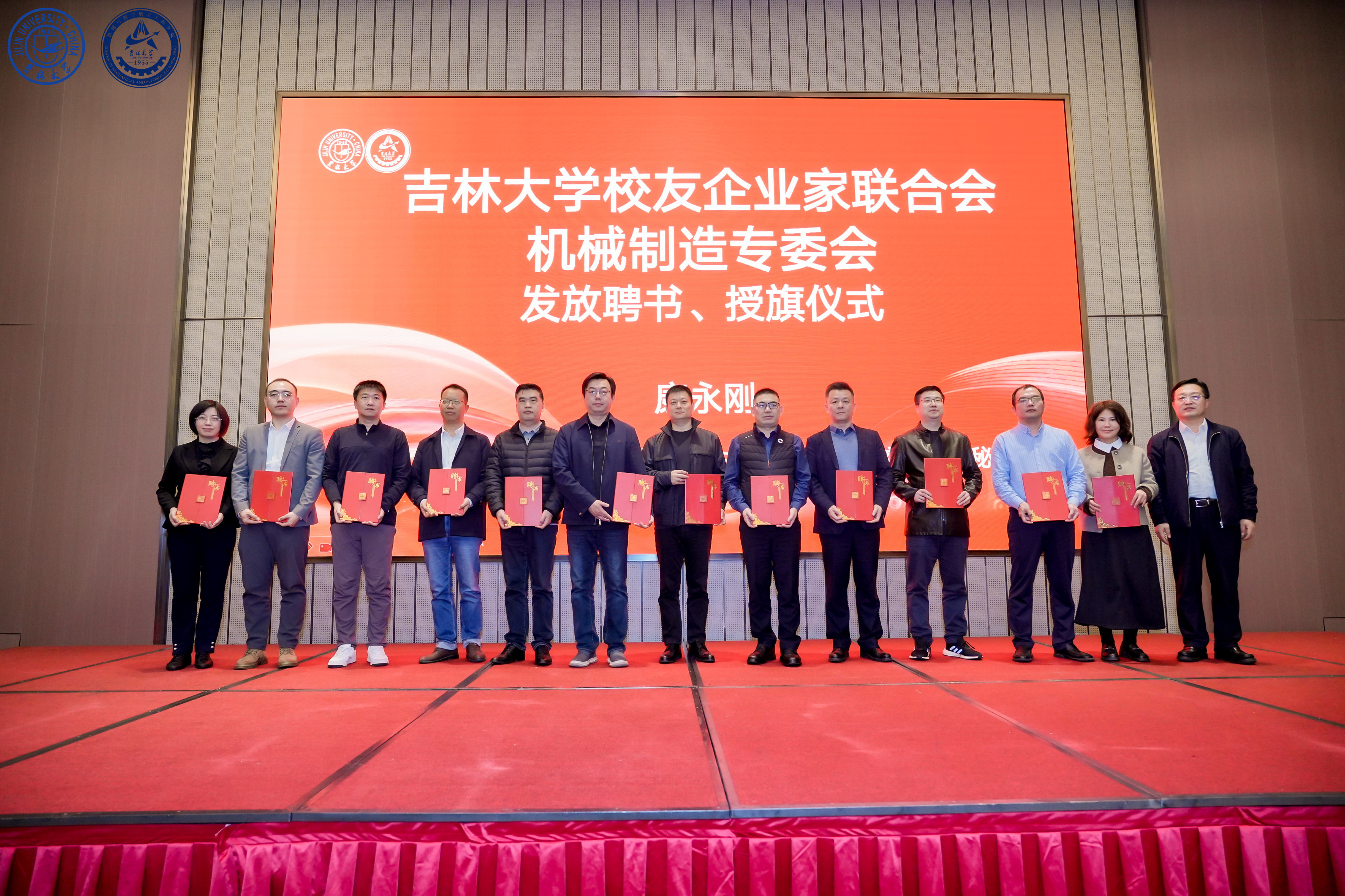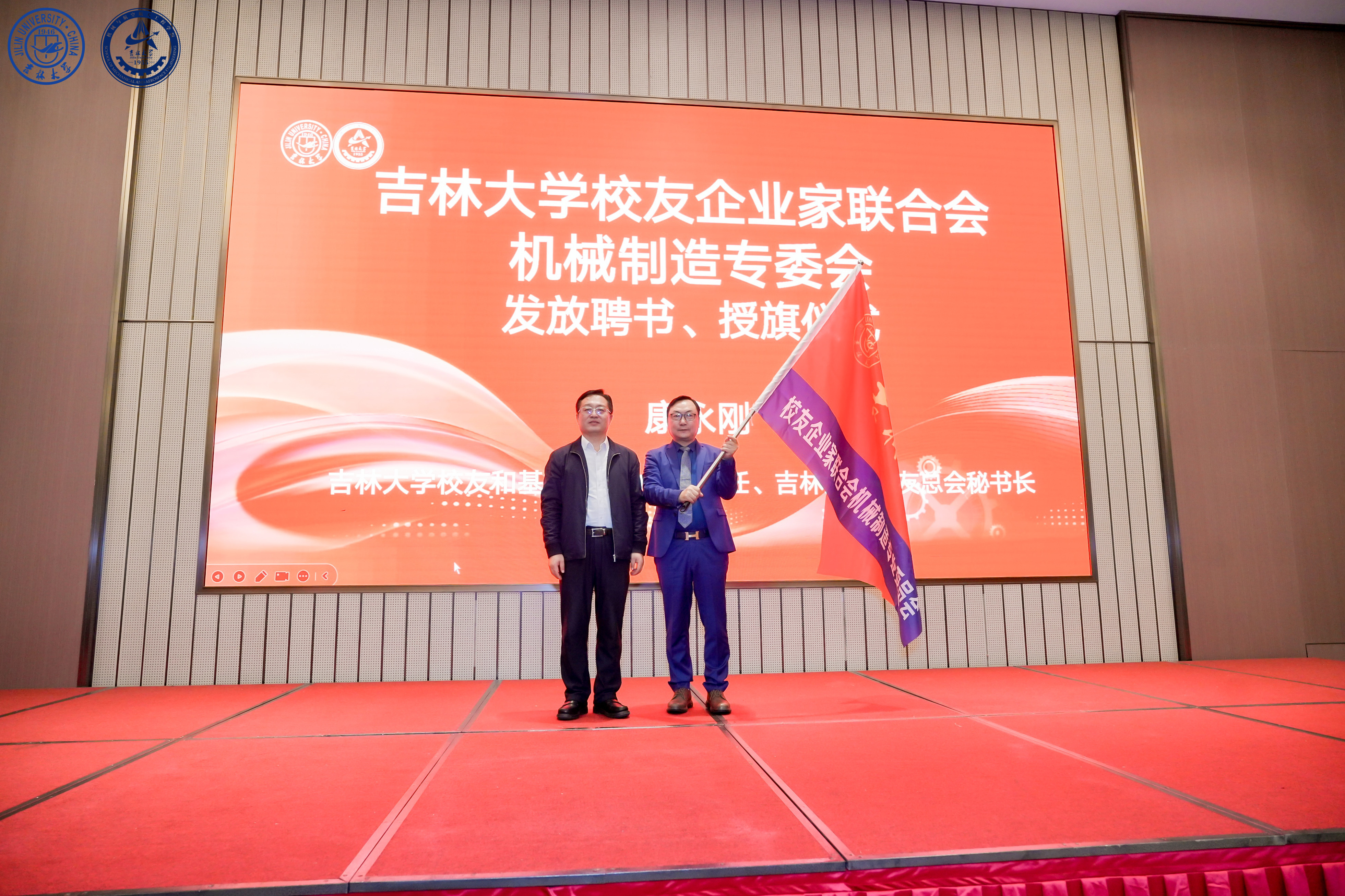 吉林大学校友和基金工作办公室主任、校友总会秘书长康永刚宣读了专委会第一届组织机构名单,上海诺银机电科技有限公司董事长吴金辉当选为首任会长,凤凰网深圳总编辑宋革、广东威铝铝业股份有限公司董事长陶利华、联桥集团董事长慕镕键、浙江孔辉汽车科技股份有限公司董事长郭川受聘为名誉会长。康永刚为相关人员颁发聘书并主持授旗仪式,标志着专委会正式启动运行。