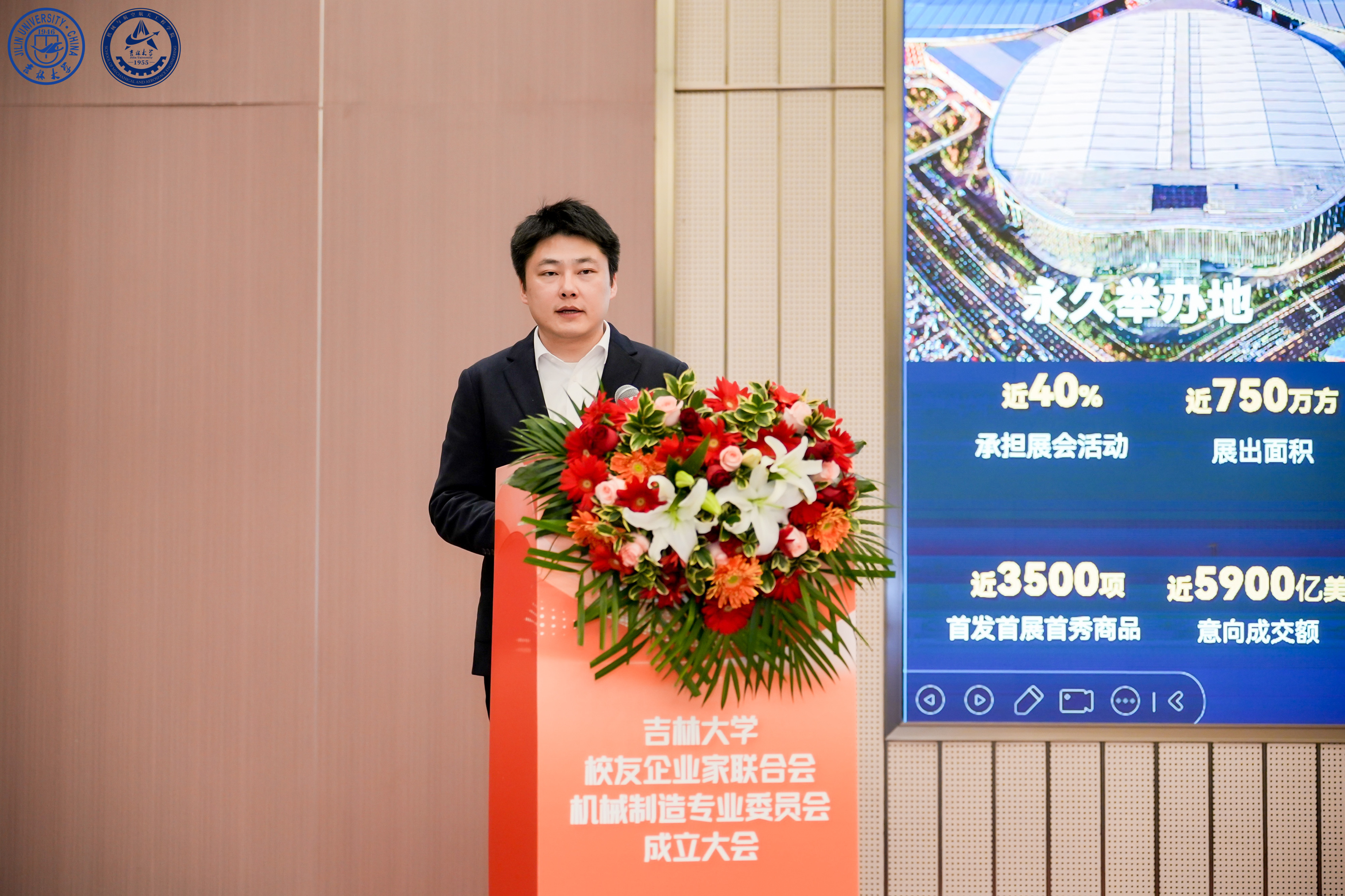 青浦区委常委、副区长李峰在致辞中详细介绍了青浦区作为进博会永久举办地、长三角一体化示范区先行启动区等多重战略定位。青浦正全力构建“3+3+3”现代化产业体系,其中高端装备制造是三大千亿级产业集群之一,与机械制造专委会的发展方向高度契合。热情邀请吉大校友企业家投资青浦、扎根青浦,共享发展红利。