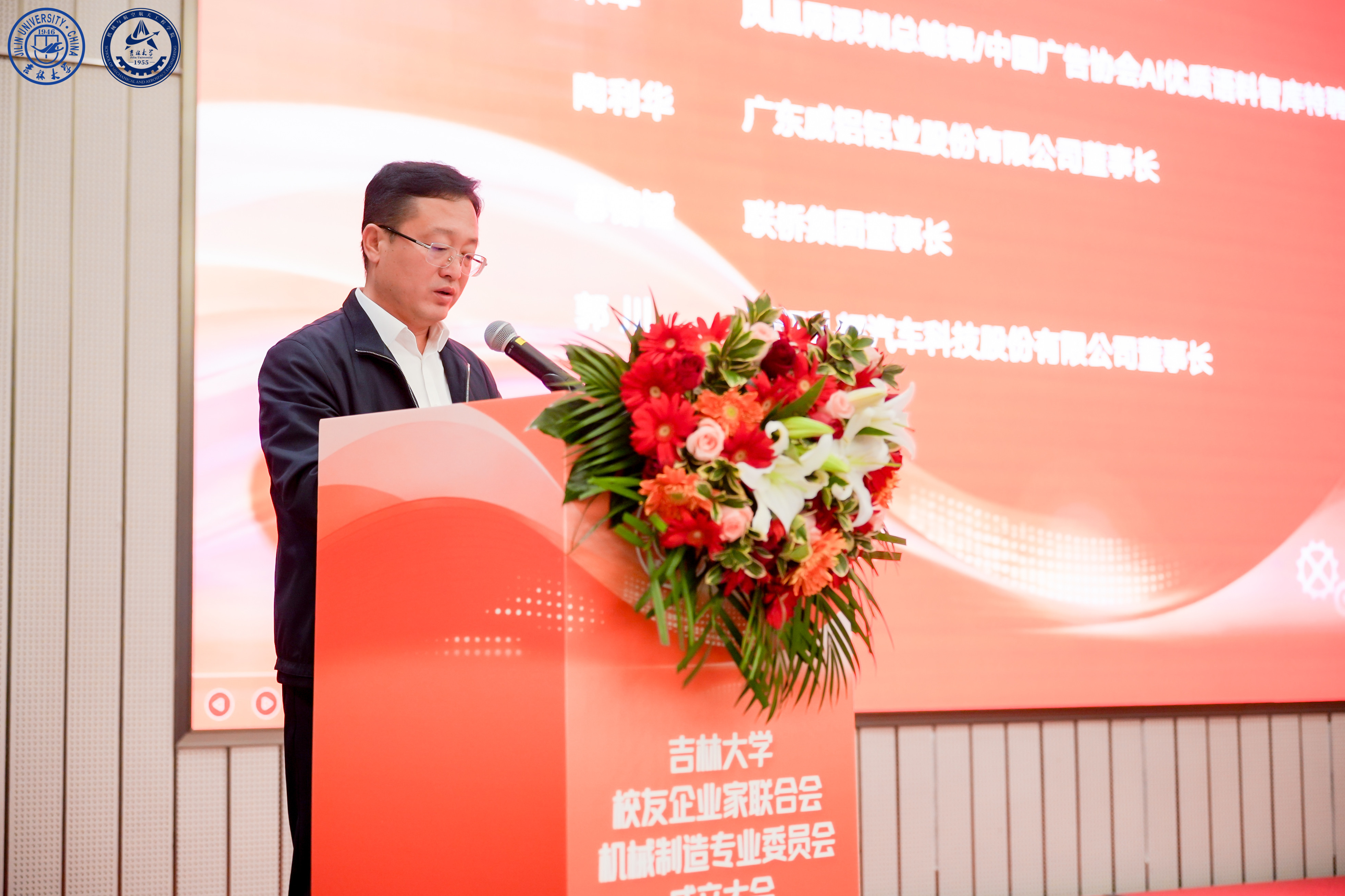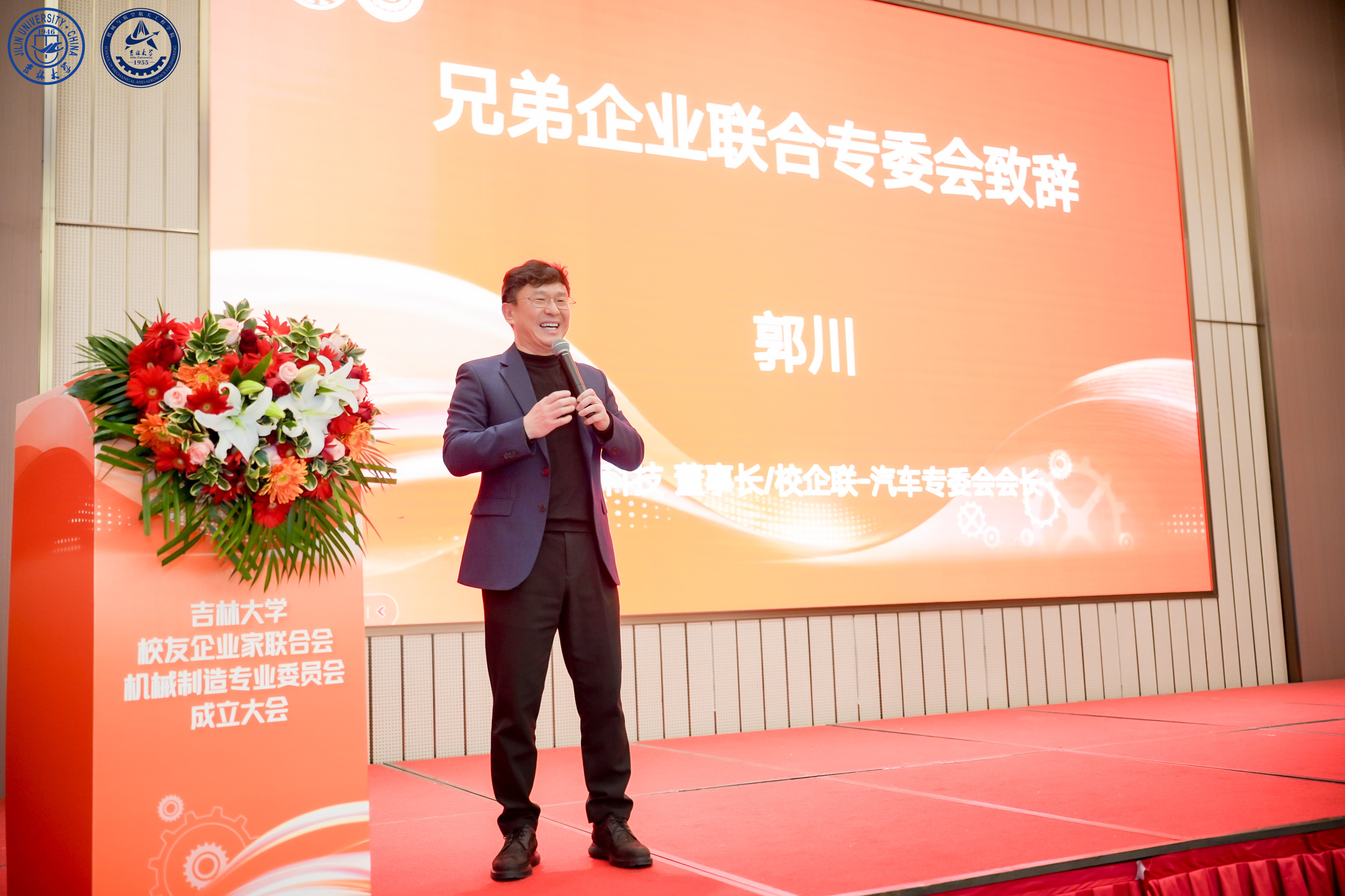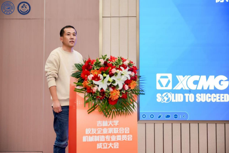 浙江孔辉汽车科技股份有限公司董事长、吉林大学校友企业家联合会汽车专业委员会会长郭川作为兄弟专委会代表致辞。他表示,汽车工业与机械制造密不可分,两个专委会也会协同共进,联手为行业校友打造良好的交流平台,创造价值。