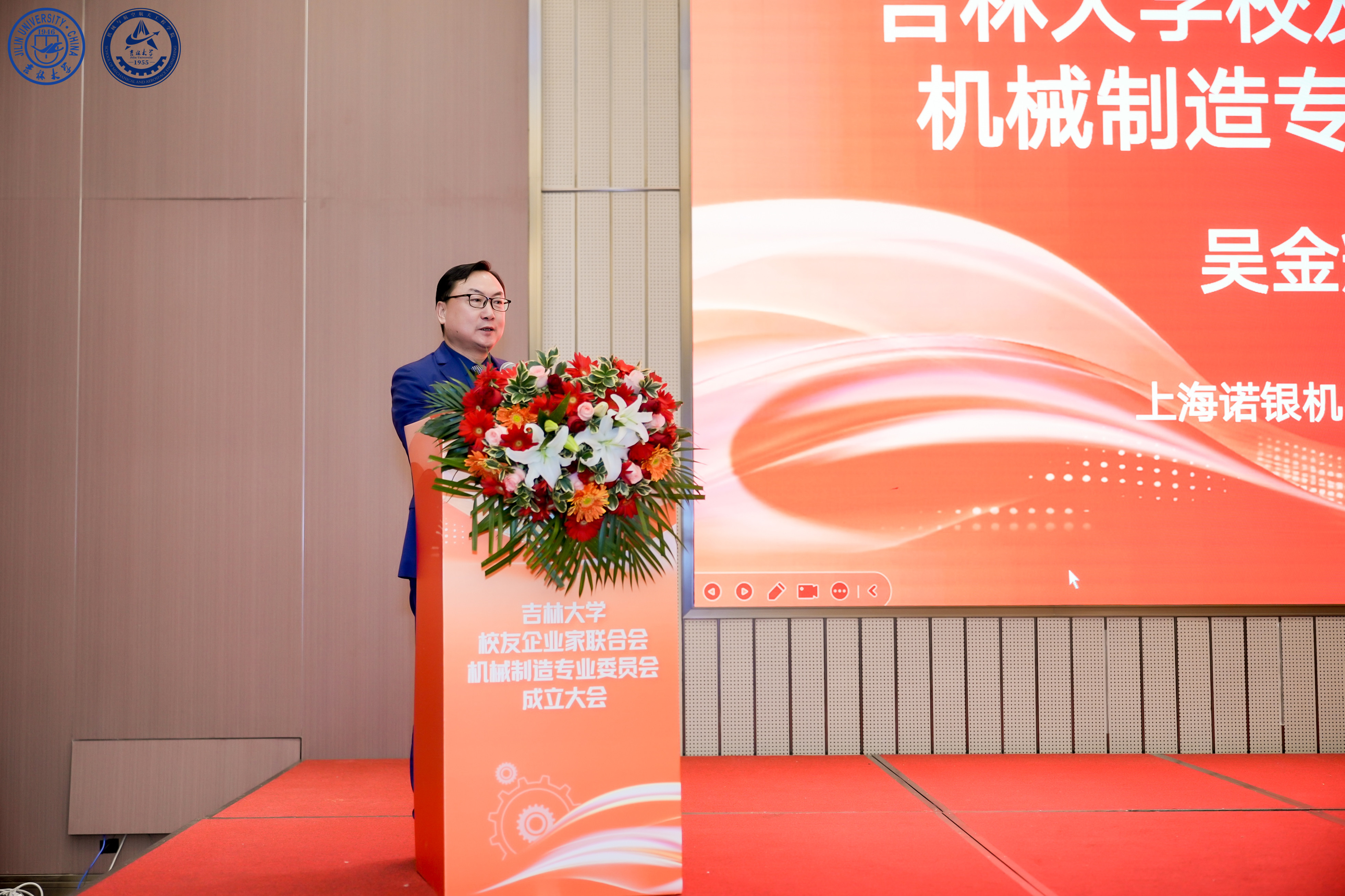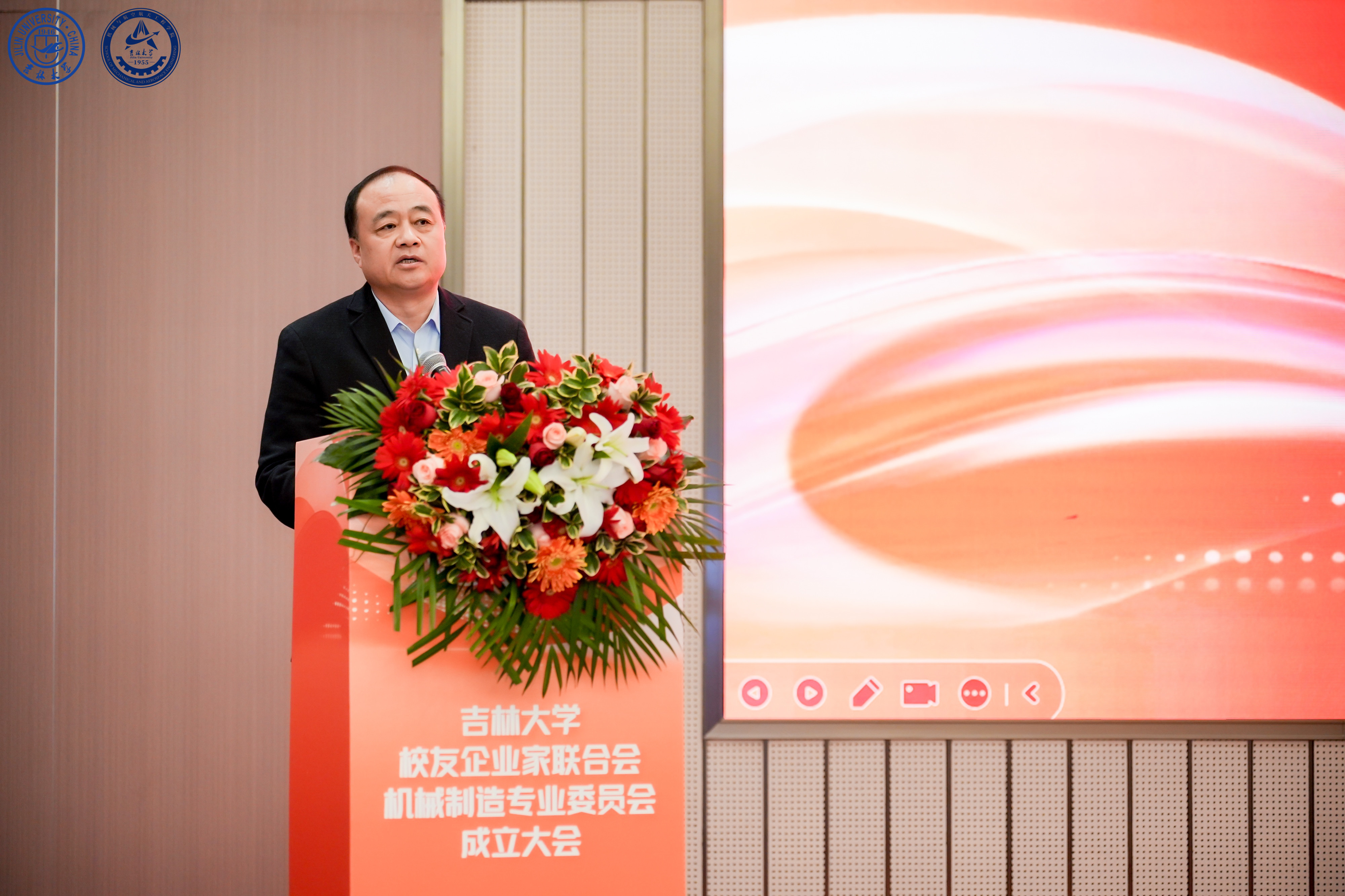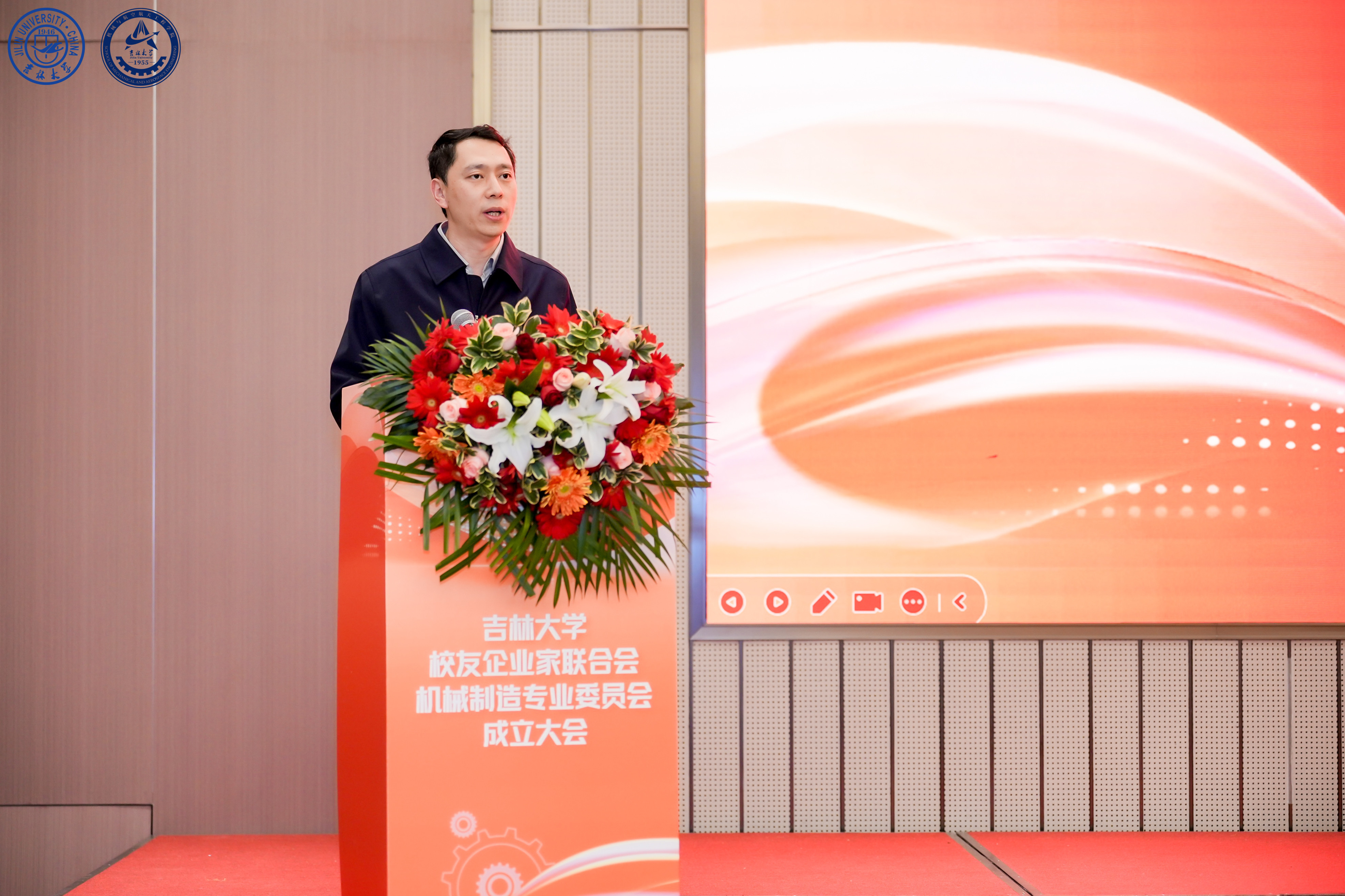 浙江孔辉汽车科技股份有限公司董事长、吉林大学校友企业家联合会汽车专业委员会会长郭川作为兄弟专委会代表致辞。他表示,汽车工业与机械制造密不可分,两个专委会也会协同共进,联手为行业校友打造良好的交流平台,创造价值。