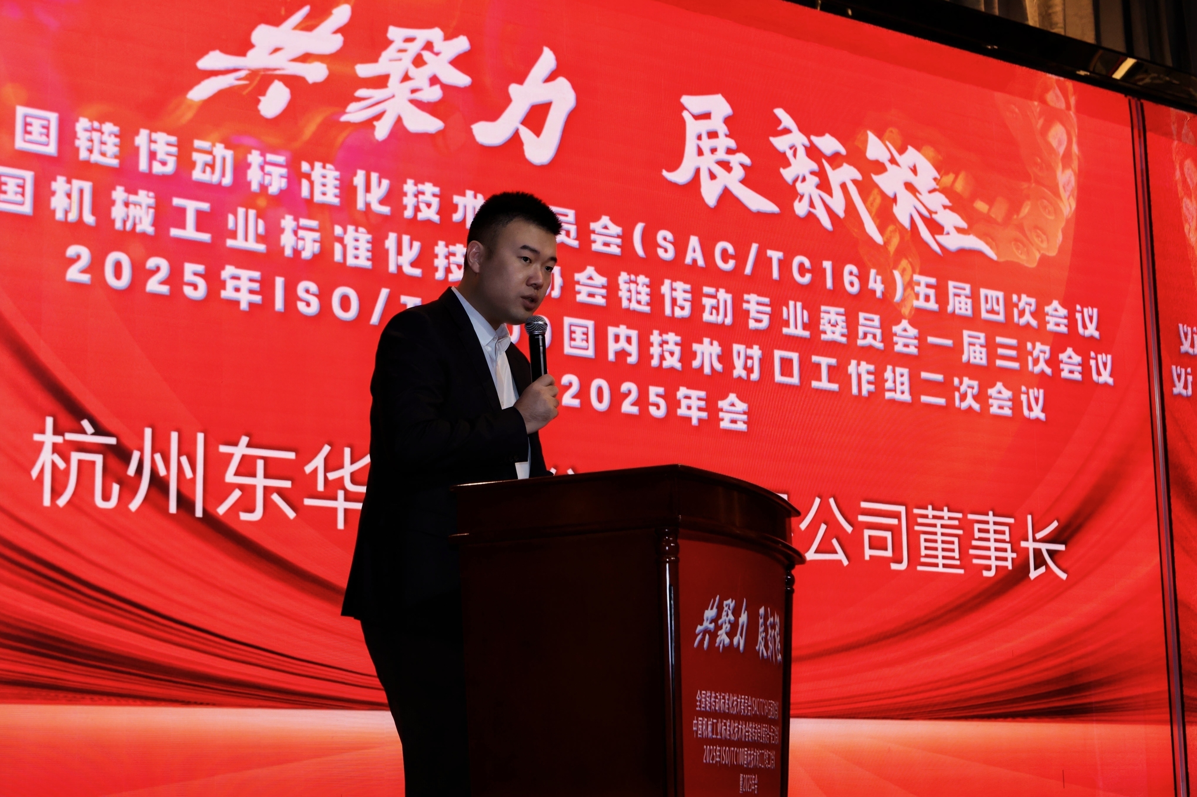 宣成致欢迎词,代表东华链条向各级政府以及各级主管部门、各位专家学者、行业企业致以热烈的欢迎和最诚挚的感谢!他表示,东华链条集团自创立以来始终坚持将标准化作为企业技术创新以及品质提升核心战略,东华不仅是标准化的执行者,更是标准的参与者和推动者。东华将继续加大研发投入,推动产、研、学、用深度融合,助力链传动行业标准高水平发展。