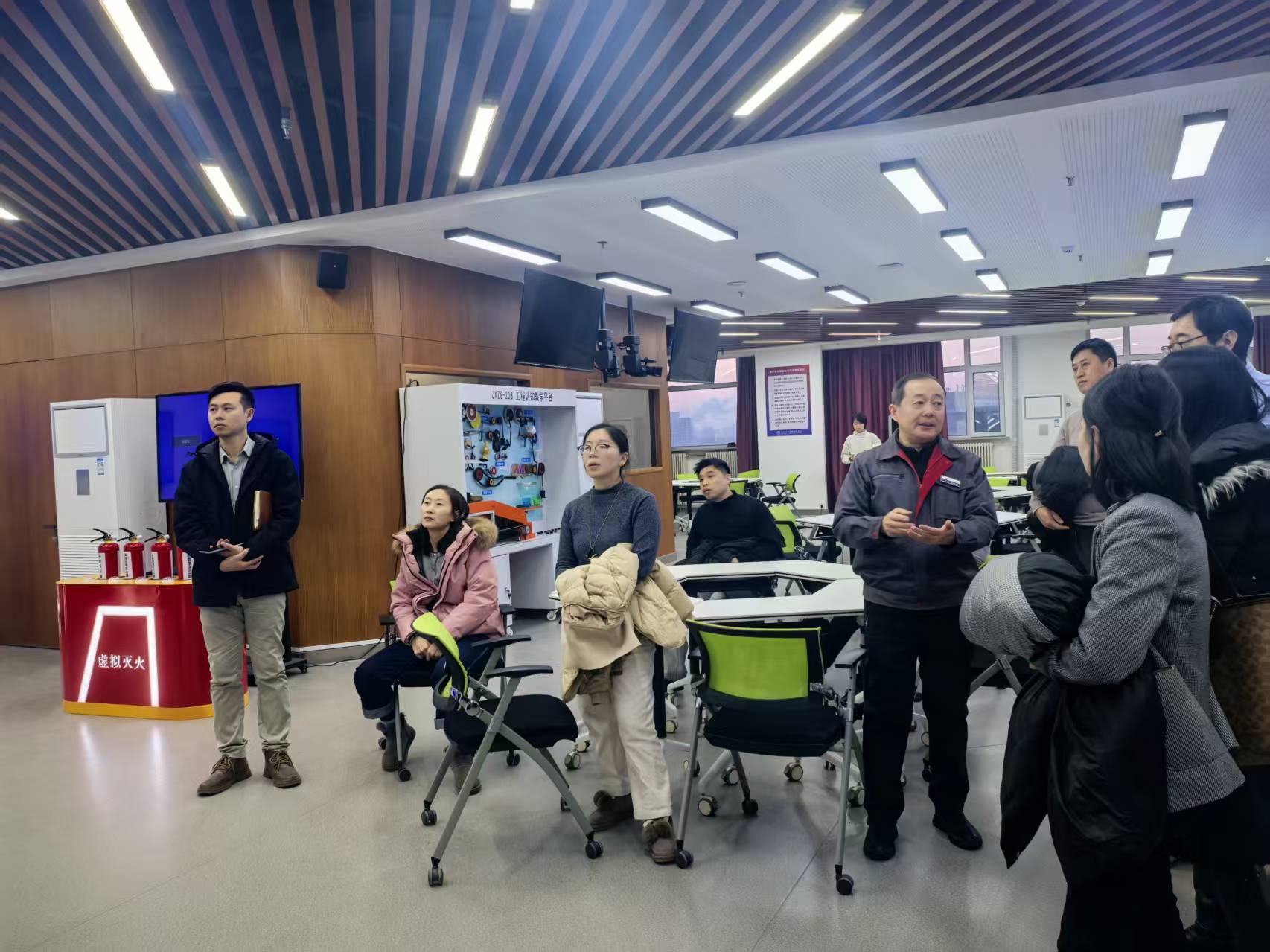 本次调研交流活动分为实地参观与研讨座谈两个环节。在吉林大学工程训练中心教务办公室主任曲晓海的带领下,大连理工大学调研团队先后走访了中心加工中心、虚拟焊接、智能制造、机械拆装、多线联动智能教学工厂、安全体验等各个实训模块。参观过程中,曲晓海主任详细介绍了各实训模块的功能定位、设备配置、教学场景等,重点展示了中心在传统制造技术与现代智能技术融合教学方面的实践成果,让调研团队直观感受了吉林大学工程训练的办学特色与育人氛围。