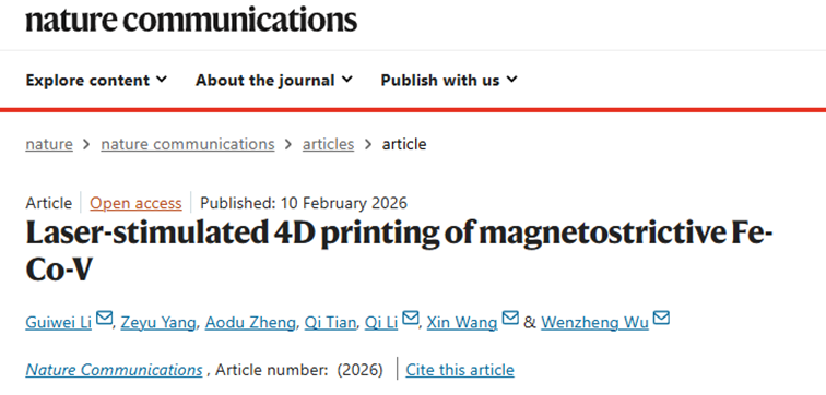 Laser-stimulated 4D printing of magnetostrictive Fe-Co-V.Nature Communications. DOI:10.1038/s41467-026-69378-0.