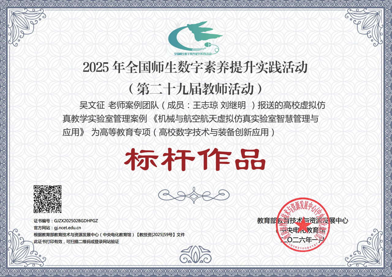 吉林大学国家级机械虚拟仿真实验教学中心2024年、2025年连续两年获批教育部教育技术与资源发展中心“高等学校虚拟仿真教学创新实验室”。2025年,高等教育专项活动设虚拟仿真实验教学、实验室管理、大型仪器设备创新应用三类案例征集,共收到154所高校提交的419件作品,最终评选出标杆作品41件、典型作品121件、展示作品194件。“机械与航空航天虚拟仿真实验室智慧管理与应用”案例成功入选标杆作品并在大会现场展示,获得与会专家与高校同行的充分肯定。