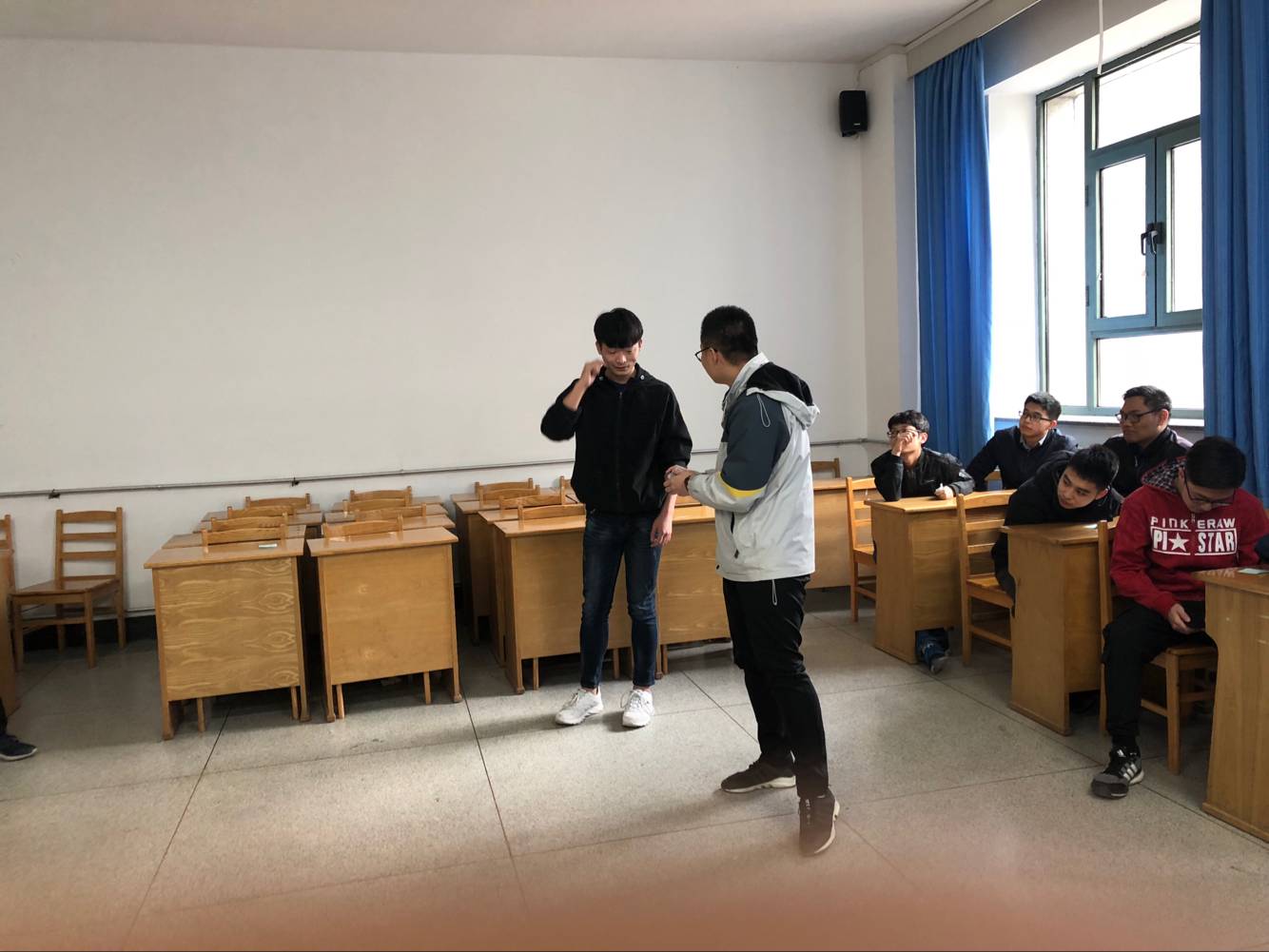 经过一系列的充分准备后,在生活委员和班长的带领下,十四班正式开始了本次班会。第一阶段是热身阶段,让一个人说出自己希望叫的名字,做出自己觉得最舒适的动作并且让其他同学模仿,同学们给自己起的名字很有意思,惹得在场同学开怀大笑。接着是抽取情绪大头贴环节,抽取者做出相应情绪,班级同学进行辨识情绪,同学们对每一种情绪表情都有不一样的理解,得出的结果各色各样。热身阶段结束后正式进入班会阶段,按名签将大家分为了四组,生活委员作为引导者询问大家近期遇到过什么烦恼或者有什么困惑,并抽取每一组的一张纸条作为该组的表演内容。在故事演绎结束后,大家以简短的语言谈了一下个人体会,分享自己对于本次班会的感受。最后,生活委员宣布此次班会圆满结束。