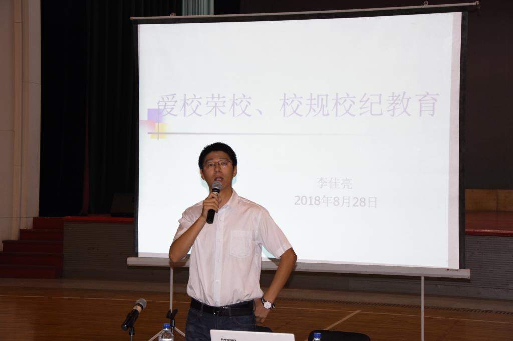 于8月28日15时在和平校区学生文化活动中心举行了2018级新生爱校荣校,校纪校规专题教育讲座,此次讲座由院学生办公室主任李佳亮主讲,2018级全体新生参加了这次讲座。