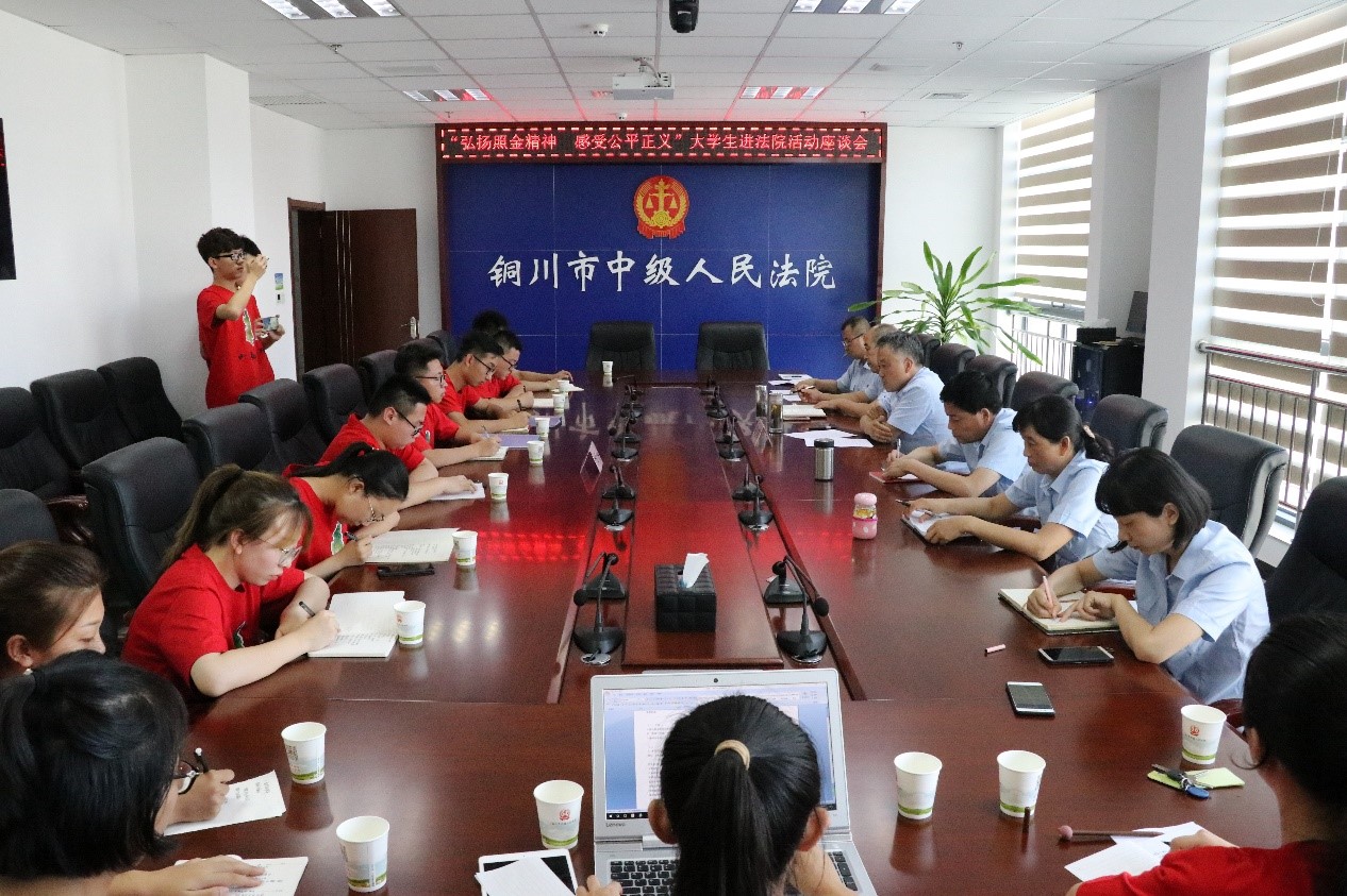 活动结束后,周少英及中院党员代表与同学们召开了座谈会。会上,由中院赔偿办副主任、团委书记杨阳向同学们介绍了铜川市的基本概况和铜川市中级人民法院工作情况,同学们紧密结合法院工作实际提出了针对性的法律问题,与党员代表进行了深入的交流研讨。
