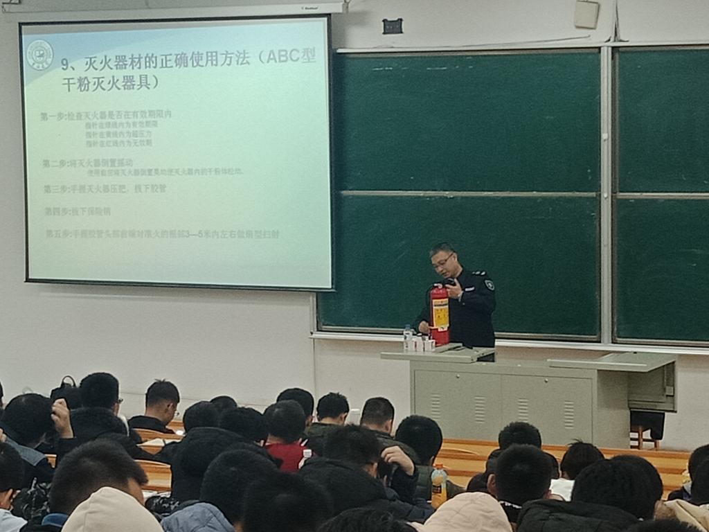 讲座上,韩旭老师为大家讲解了消防安全方面的知识。韩老师分别就如何树立消防责任意识、清除消防安全隐患、初期火灾扑救、灭火器等消防器材的使用、火情紧急情况处置知识等方面进行了全方位的培训,条理清晰的向同学们传授了不同情形下的处理办法,并结合实物对同学们进行讲解,同学们听得聚精会神。韩旭老师还引用了校内曾经的事故案例,结合图片的方式进行了详细的案例分析,案例现场的触目惊心以及授课讲师详细地分析让每一位同学都认识到了火灾的无情以及消防知识的重要性。至此,此次消防安全讲座正式结束。