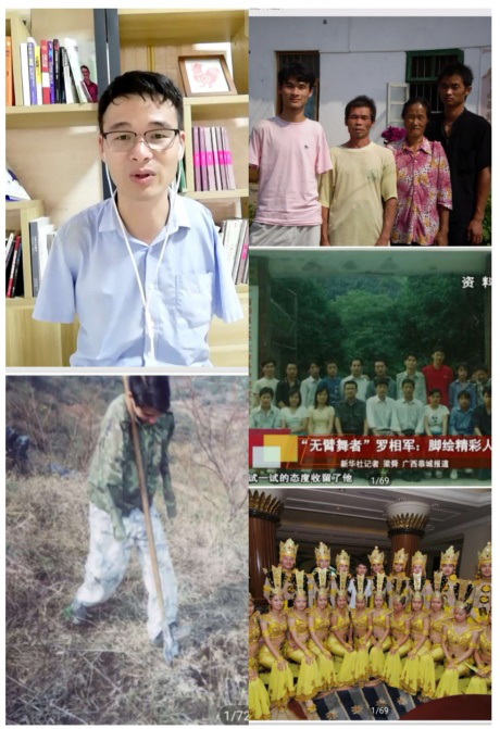 罗相军老师来自广西桂林,7岁时因电击痛失双臂,为改变命运他只身走出大山,几经坎坷只为踏上漫漫求学路。经过不懈努力,他在艺术的殿堂实现了自己的人生价值,加入中国残疾人艺术团,成为一名无臂舞蹈演员。在舞台上他舞动一双隐形的翅膀,用双脚演绎精彩的人生,在一场场精彩绝伦的演出中赢得了无数的光环,曾随团到过20多个国家作巡回演出。