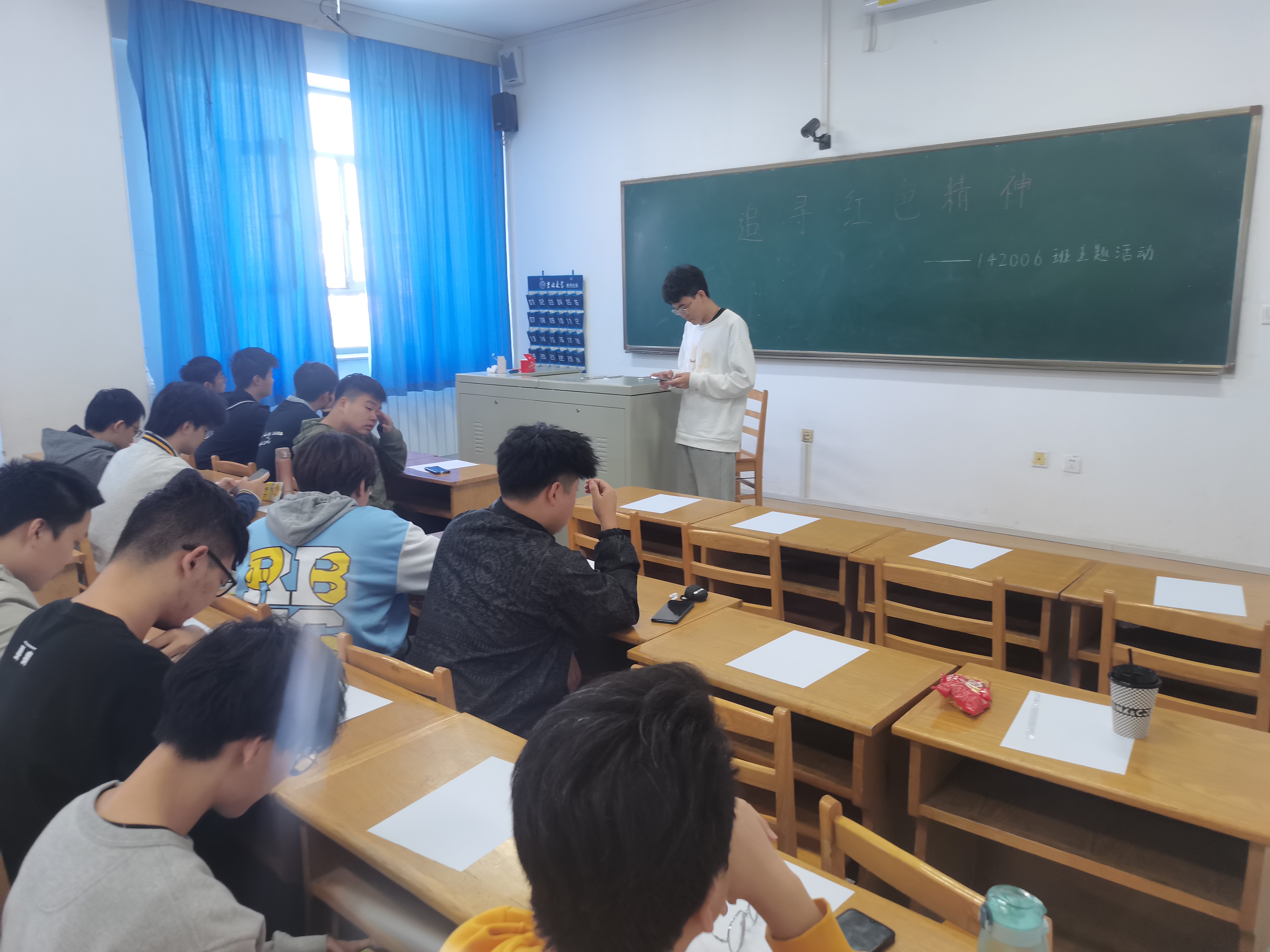 班长宣布活动开始并进行了慷慨激昂的演讲,接着开始播放以真实历史时间演绎的爱国主义电影《建党伟业》。
