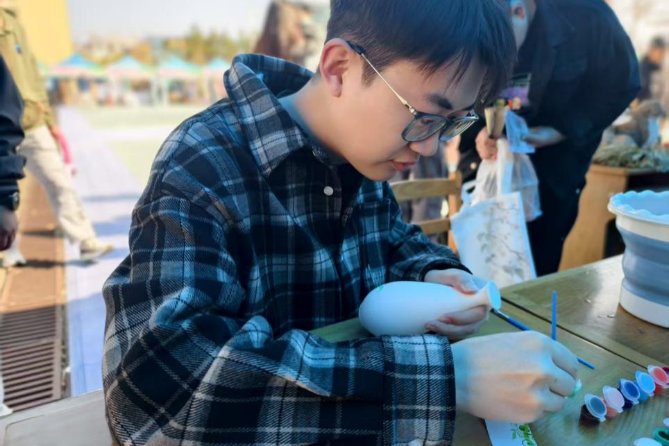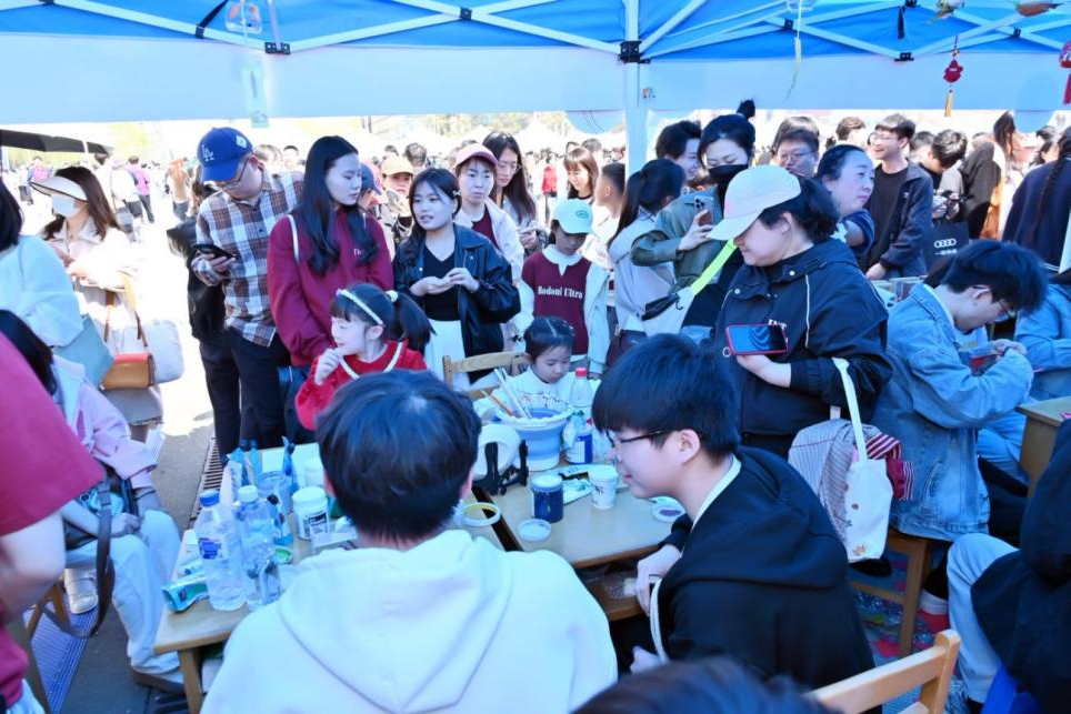 在机械学院杏花文化体验区,陶扇面彩绘活动深受欢迎。微风轻拂,杏花飘落,同学们以扇为纸,以陶为韵,手持画笔将心中美好与杏花春色巧妙融合。