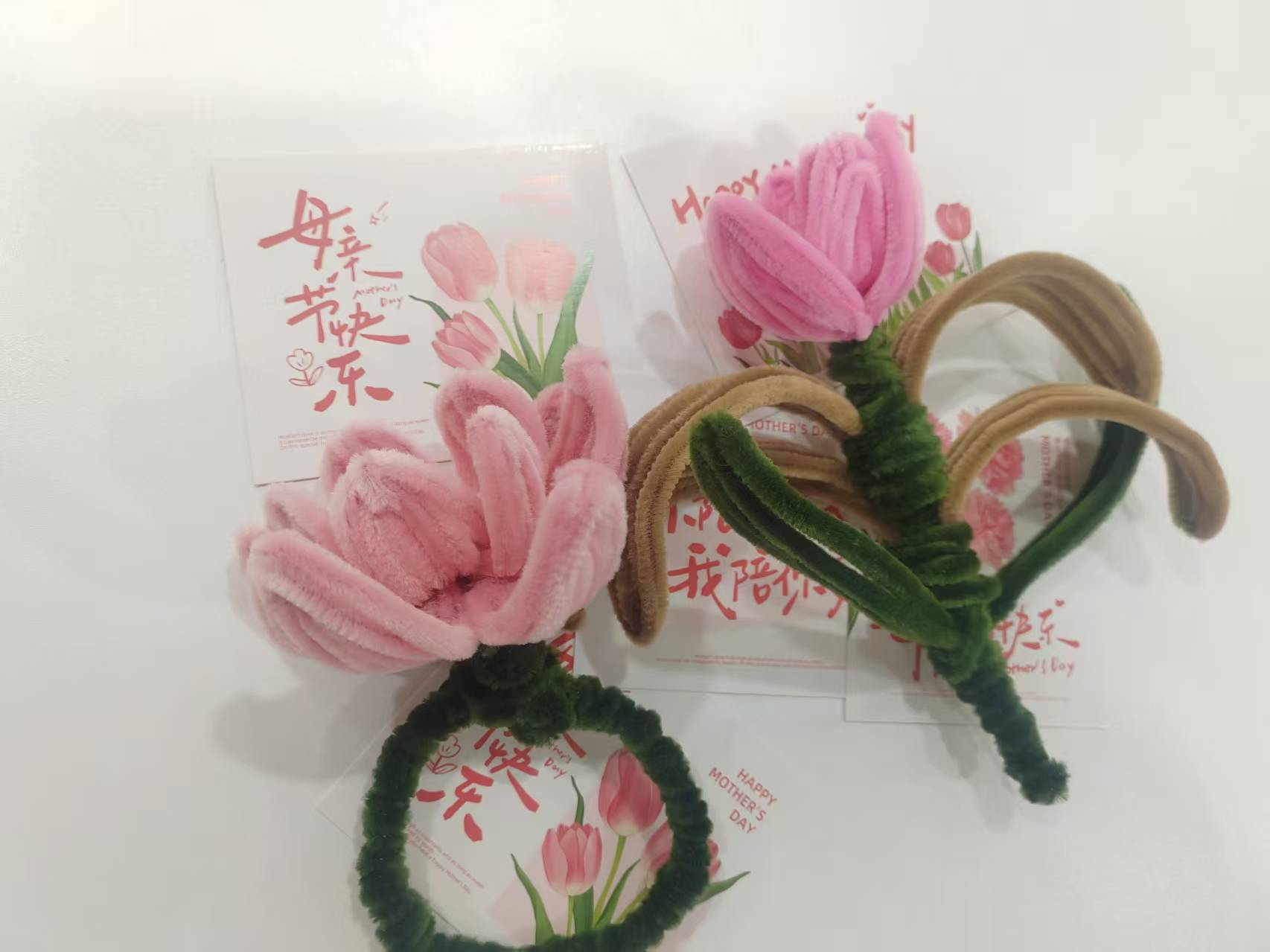 活动包括“手工扭花制作”与“水拓丝巾”两个特色活动。在手工扭花制作活动中,同学们手握扭扭棒,巧思妙想,通过弯折、扭转等手法,将这一柔软材料幻化成一束束精美的康乃馨、玫瑰等立体花束,每一朵花都饱含着对母亲的感激与敬爱。