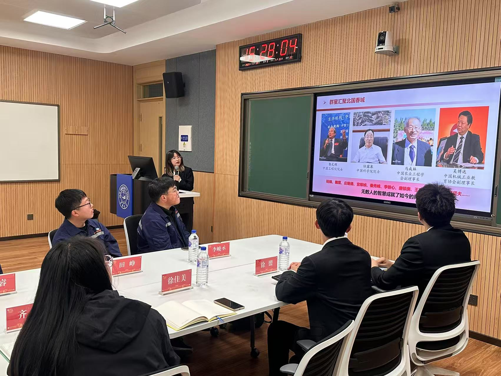 首先,主持人徐盟以“青年在哪里,团组织就在哪里”为开场,强调团组织在凝聚青年、服务大局中的核心作用。随后,学院学生代表郝梦扬介绍了学院大学生科技竞赛情况,吉林机场集团设备管理部代表王睿介绍了集团科创成果,重点介绍机械臂自动化项目、登机桥紧急撤桥技术及自主研发的登机桥模拟器。最后,徐佳美通过“北上精神”主题宣讲,与参会人员一同回顾了饶斌、陈炳聪、黄叔培等老一辈机械领域先驱的奋斗历程,激励青年传承匠心、勇担使命。