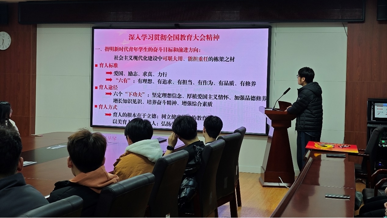 为深入贯彻落实全国教育大会精神,引导研究生党员将个人成长与教育强国战略紧密结合,3月25日,学院组织研究生党员在机械材料馆529室开展深入贯彻全国教育大会精神学习活动。活动由2024级硕士学生第一党支部副书记王钰铭主持。