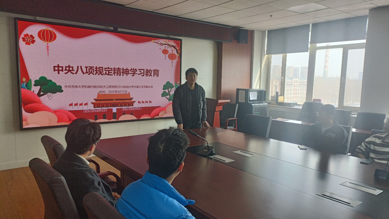 为进一步巩固拓展落实中央八项规定精神成果,持之以恒正风肃纪,4月10日,学院组织研究生党员在机械馆529室开展深入贯彻中央八项规定精神学习教育活动。活动由2023级硕士生第三党支部书记余乐主持。