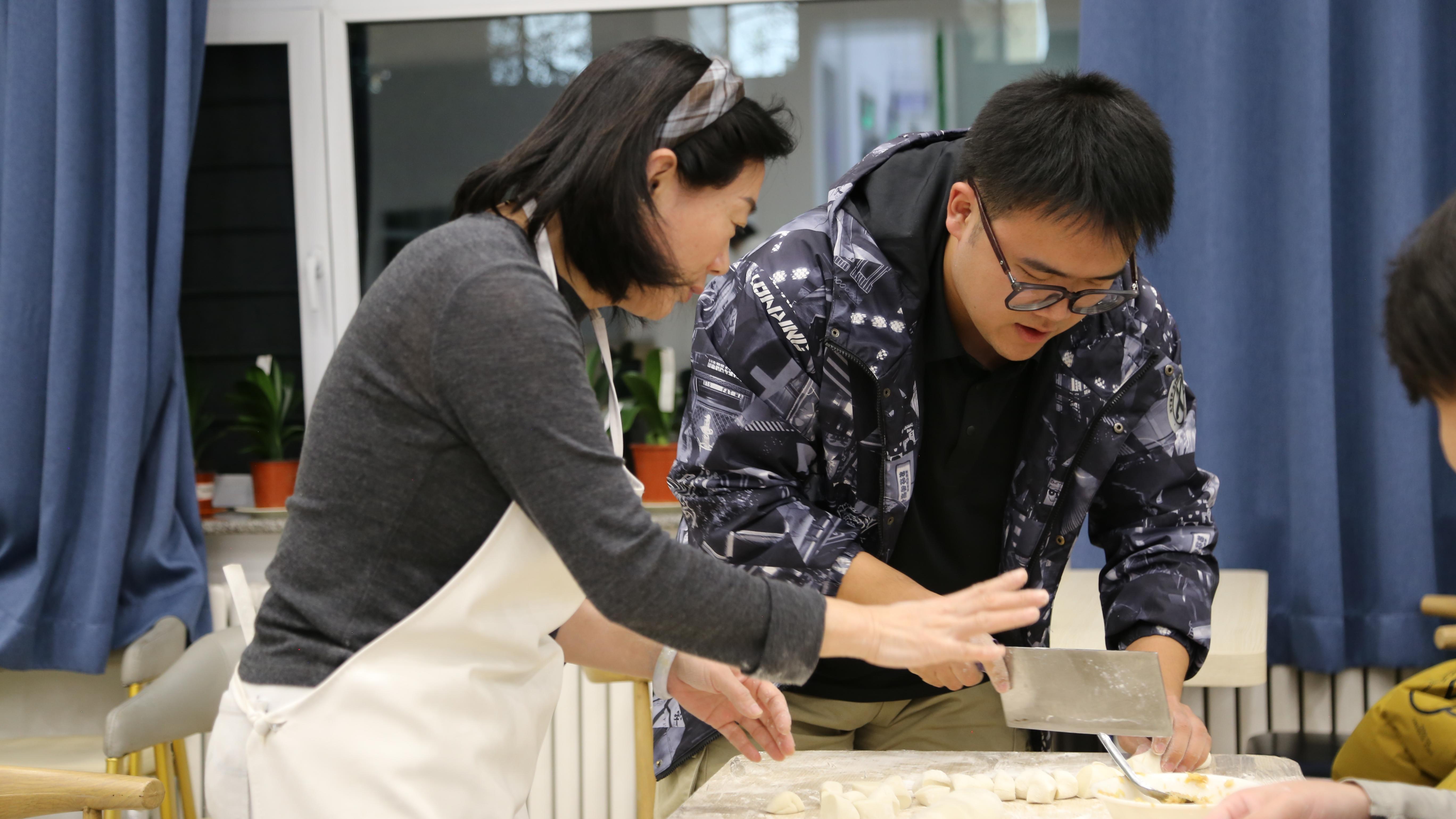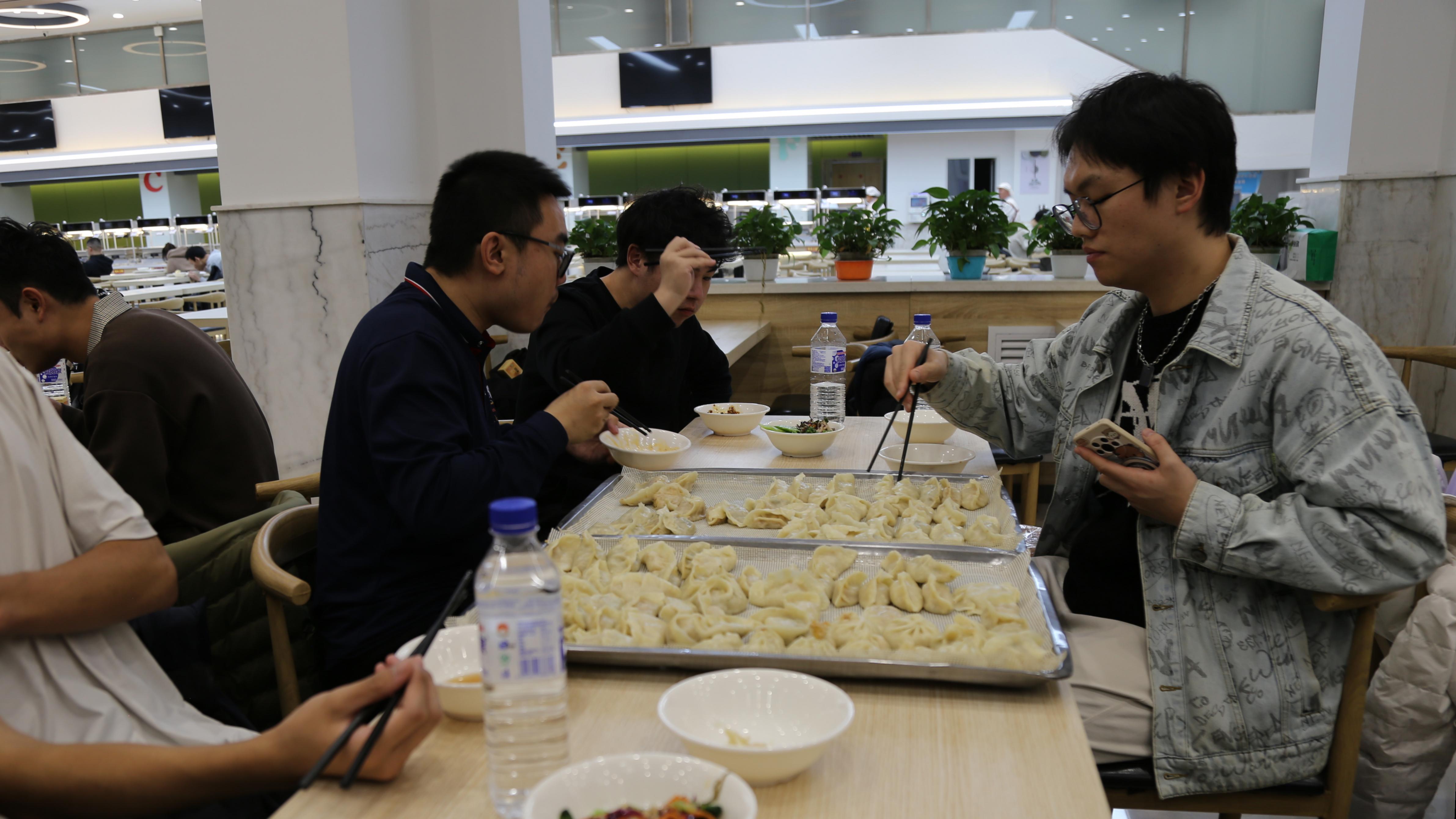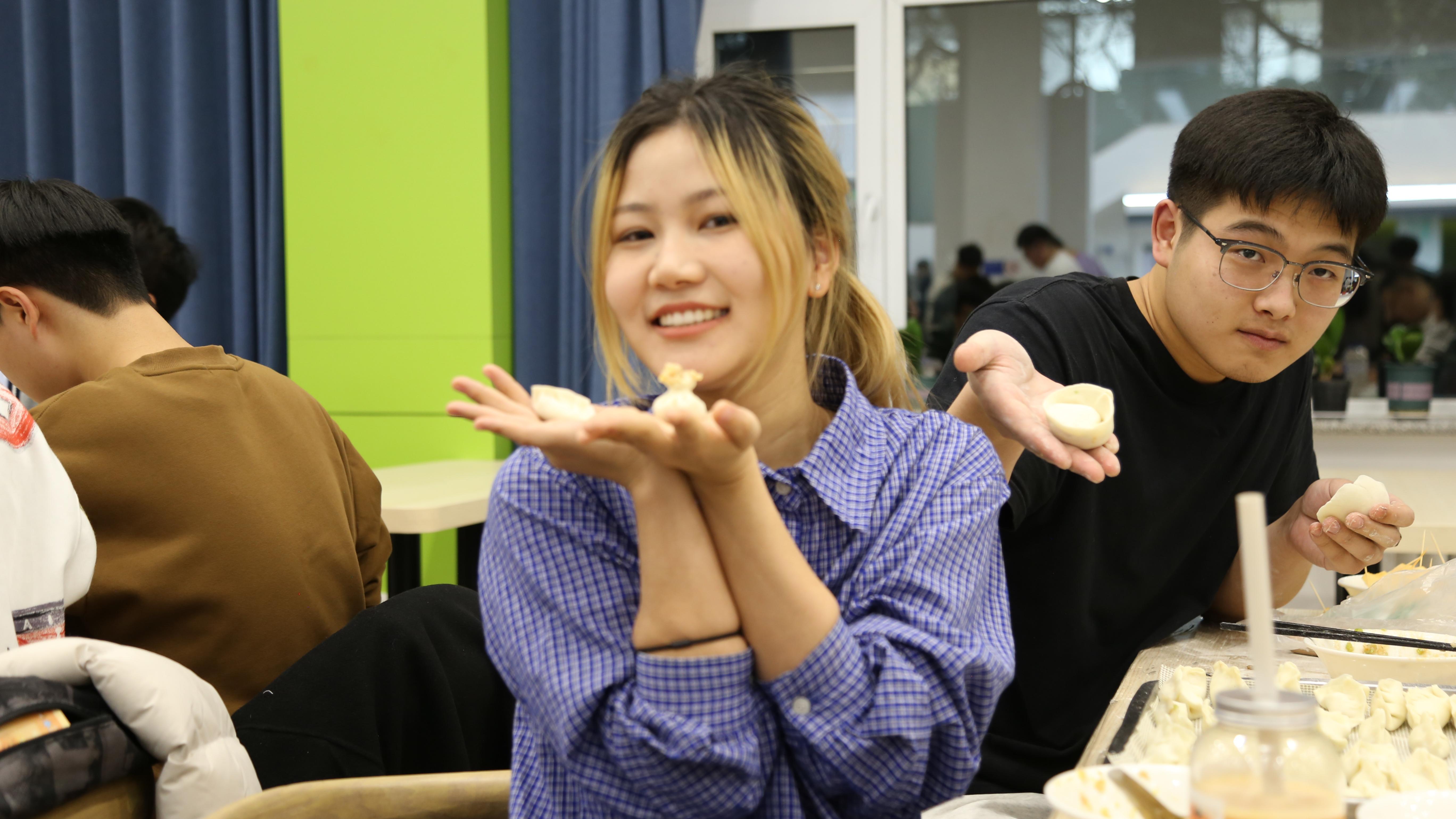 活动现场氛围轻松融洽。简短的破冰交流后,同学们迅速自由组队、明确分工,从面团搓条切剂、擀制面皮到包制馅料,有条不紊地推进这项“集体任务”。包饺子过程中,不少同学手法娴熟、动作麻利,展现出扎实的动手能力;初次尝试的同学则在餐厅工作人员与同伴的耐心指导下认真摸索,从捏合褶纹到把控馅量,逐步掌握技巧。大家包制的饺子造型多样,或饱满规整、或创意十足,欢声笑语间,彼此的距离不断拉近。待饺子新鲜出锅,同学们围坐共品劳动成果,在氤氲热气中分享美食、畅谈心声,暖意融融。