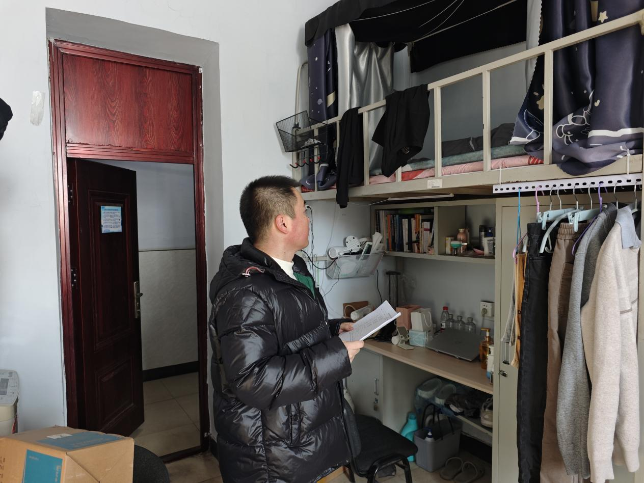为加强寒假期间研究生公寓安全管理,保障学生安全、有序离校,1月20日下午,学院组织开展研究生寝室安全卫生检查工作。研究生辅导员张瑛、曲艺深入各公寓楼,走访检查研究生寝室并开展安全教育。
