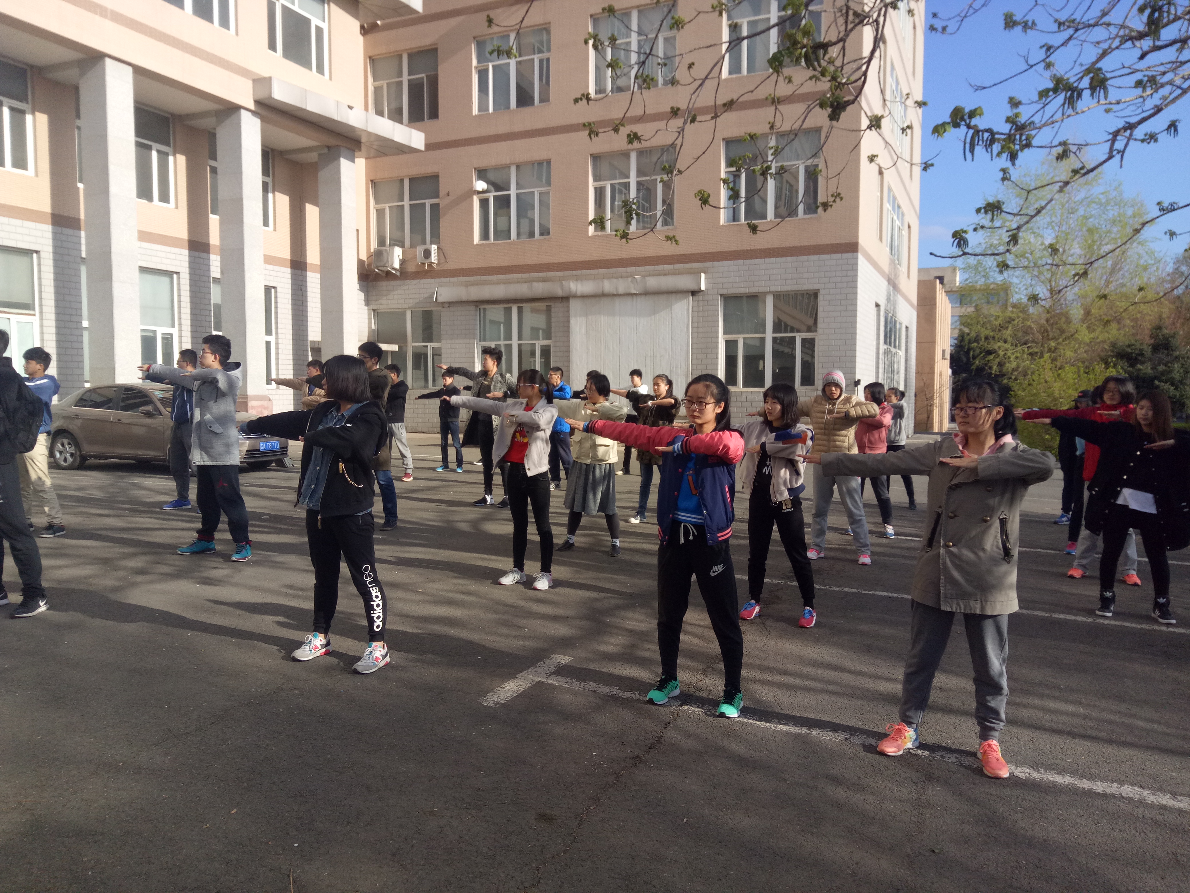 每天晚上9点15分,同学们准时在12公寓门前的空地上集合,各自签到后便按照队形有序站好,等待着健美操的训练。学生干部首先为同学们做动作讲解,为使同学们快速掌握每个动作的要领,他们会先给大家做示范,然后大家再跟着节拍进行练习。参与项目练习的同学都很积极地配合,不懂的地方会主动询问,对于健美操的动作更是一丝不苟。初春的夜晚依旧有些寒冷,但是同学们积极洋溢的激情却温暖了每个人的心田,学生干部们关切耐心的指导也使整个训练过程充满温馨。经过几天的动作练习,大家的整体水平有了显著提高。