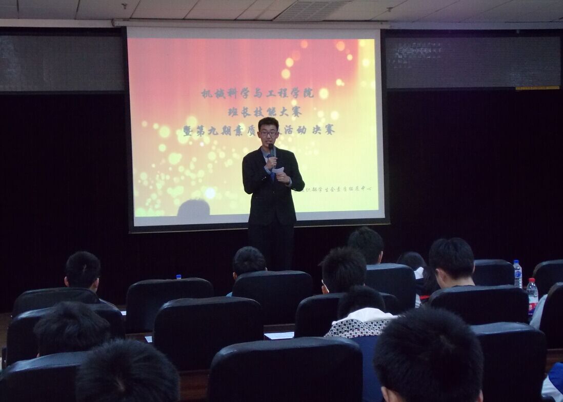 为提高机械学院2014级各班班长的综合素质,锻炼各班班长的表达能力、社交能力、实践能力,培养各班班长协调和处理人际关系的艺术与技巧,使其能充分展示自己的风采面貌,成为一名经得起考验的合格班长,机械学院团委组织部、学生会素质拓展中心于24日晚在机械材料馆8楼学术报告厅联合举办了此次“班长技能大赛”决赛。机械学院团委负责人夏禹老师、主席团部分成员、2014级全体班长参加了本次比赛。