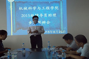 为深入做好2015年迎新工作,8月23日下午,机械学院在机械馆725会议室举办了2015级辅导员助理竞职答辩会。评委由各系副主任以及学工办全体老师组成,参加竞职的同学为2012级和2013级优秀学生,
