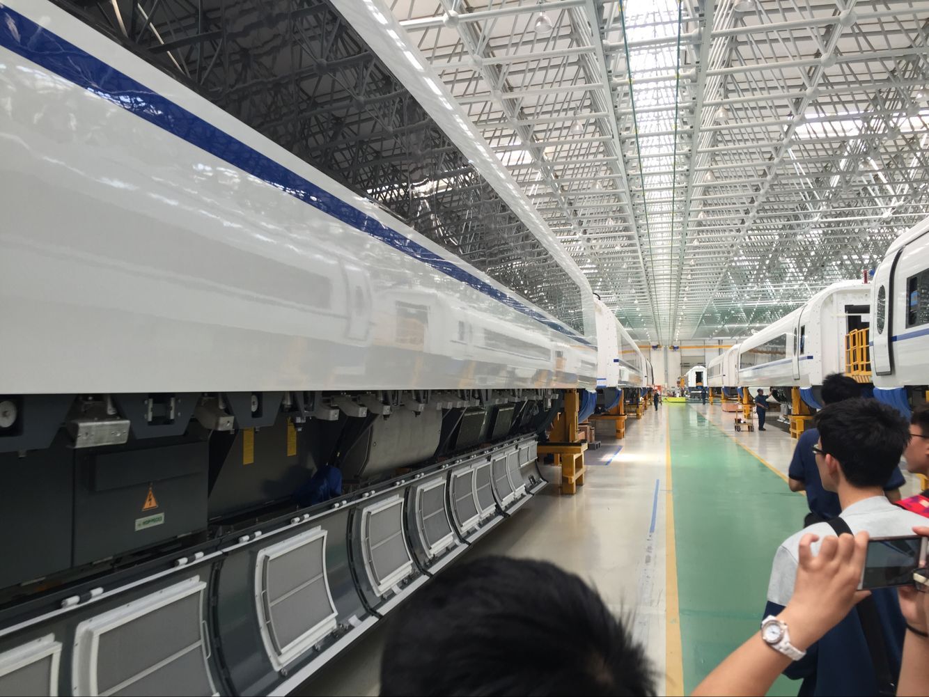 中国中车是全球规模最大、品种最全、技术领先的轨道交通装备供应商。该公司制造的高速动车组系列产品,已经成为中国向世界展示发展成就的重要名片。为此参观之行,五班同学提前一周制作了调查问卷,调查得来的问题和统计得来的数据使同学们能够带着问题走进工厂。同学们在邓海高级工程师的引领和陪同下,先后参观了两个车辆生产车间和一个重点实验室,并且进行了亲密的交流和互动。首先,同学们进入生产车间,认真地听取了工作人员对整个工厂和生产流程的介绍,并且近距离地感受了每一道工序蕴含的高精尖技术要求以及严精细实的工作态度。随后,同学们一起观看了习近平总书记参观中国中车时发表的重要讲话,正确认识到了技术发展对于国家发展的重要意义。接着,同学们又进入实验室参观最高端技术的产生和发展过程。参观完成后,同学们和高级工程师近距离互动,邓工专业且耐心地回答了同学们层出不穷的提问。最后,五班同学与邓工交换了纪念品,并合影留念。